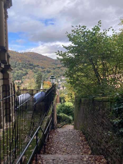 누군지 잘 모르는 시인이자 소설가의 비석도 찍어봤다. 양지바른 곳에 계시더라구요. 그리고 하이델베르크 성에서 다시 시가지로 내려오는 계단길.