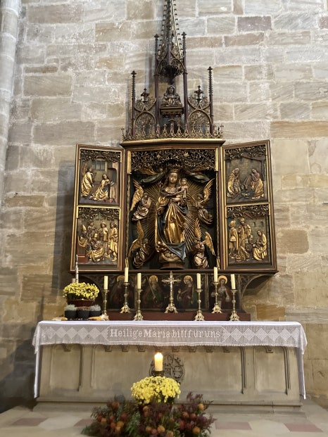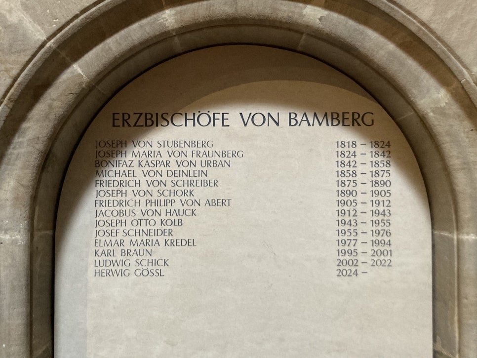 번쩍번쩍 화려한 성모 마리아 상. 밑에 쓰여 있는 Heilige Maria bittefüruns 는 ‘성모 마리아 님 우리를 위해 기도해 주세요’ 라는 뜻이라고 구글 번역기가 알려줬다. 미술 양식은 잘 모르지만 정말 아름다운 조각상이었다. 성당 한 구석엔 밤베르크의 대주교를 지낸 사람들의 명단이 남아 있었는데 마차살에선 밤베르크 대주교가 꽤 중요한 인물이었기 때문에 나도 모르게 명단을 열심히 보게 됐다. 어디 보자 19세기 후반이면..