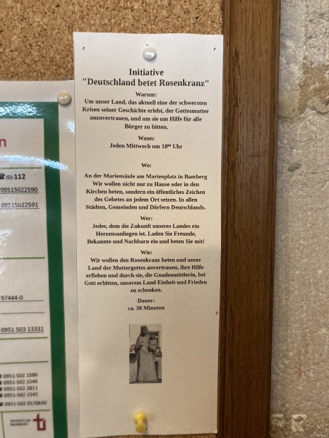 성당 입구 게시판에 붙어 있던 팜플렛. 이게 2025년판 Jesus calls us—! 인지 진짜 건전한 모임인지 잘 분간이 가지 않았다. 이런 모임에 실제로 가면 무엇을 하는 걸까? 독일어는 한 마디도 할 줄 모르지만 30분짜리 설교라면 저도 그 자리에 있어보고 싶습니다. 혹시 청강 가능한지..