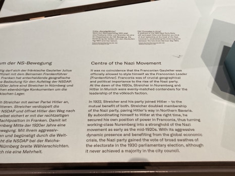 It was no coincidence that the Franconian Gauleiter was officially allowed to style himself as the Franconian Leader. Franconia was of crucial geographical and political importance to the rise of the Nazi party. 전시공간 소개글의 첫 문장을 읽으면서, 이곳을 알면 알수록 Franconian 이라는 단어가 점점 불미스럽게 느껴진다고 생각했다. 이곳의 오랜 지역 정체성이고 자부심이지만 바로 그랬기 때문에 나치에게도 자부심이 됐다는 게 참 아이러니하다. Streicher in Nuremberg and Hitler in Munich 는 또 왜 이렇게 도원결의마냥 라임이 쫙쫙 맞게 읽혀서 여행 온 사람을 당혹스럽게 할까요. 내가 바이에른에 기대한 건 루카스와 레오의 발자취 쫓기였는데 실제로 가장 자세히 보게 되는 건 히틀러의 흔적이라니 마음이 조금 힘들었다. 『마차살』에서 뉘른베르크를 반파시킨 것은? 레오의 고유 능력. 실제로 뉘른베르크를 반파시킨 것은? 양차대전.