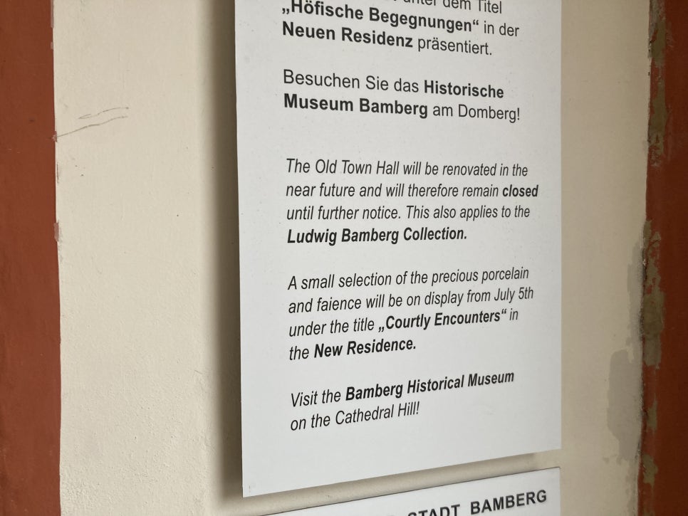 구 시청사 내부는 현재 리모델링 중이라 아쉽게도 관람이 불가능했다. 대신 내부 박물관에 전시되어 있던 도자기 중 일부를 밤베르크 대성당 바로 옆에 있는 뉴 레지던스에서 볼 수 있다는듯. 순식간에 없어져버린 컨텐츠에 조금 충격을 받았지만(이거 보려고 왔는데!) 마차살 독자로서는 내부를 볼 수 없는 게 오히려 상상을 자극하는 방향이기도 해서 ‘리모델링은 핑계고 사실은 저 안에서 무슨 일이..!’ 하고 혼자 즐거운 상상극장을 펼쳤다. 사람이 뭘 좋아하면 이렇게 가지가지 방법으로 놀 수 있다.
